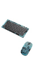 This wireless keyboard and mouse set is in a bright blue, exotic animal print with scripted lettering on the keys, and logo details on the mouse. Plastic feet prop up the keyboard for ease of use and the USB cord included.